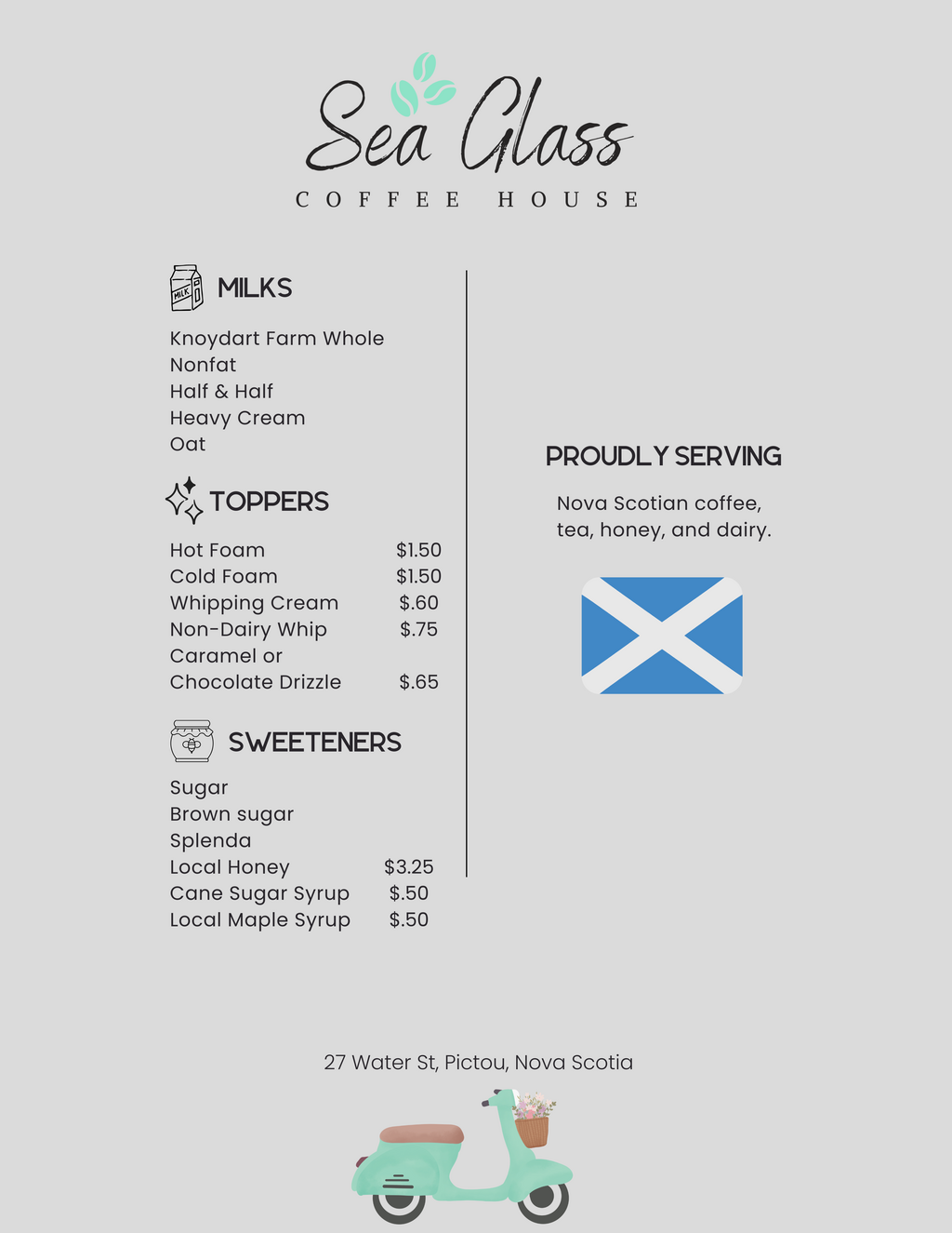 Proudly serving Nova Scotian coffee, tea, honey, and dairy.